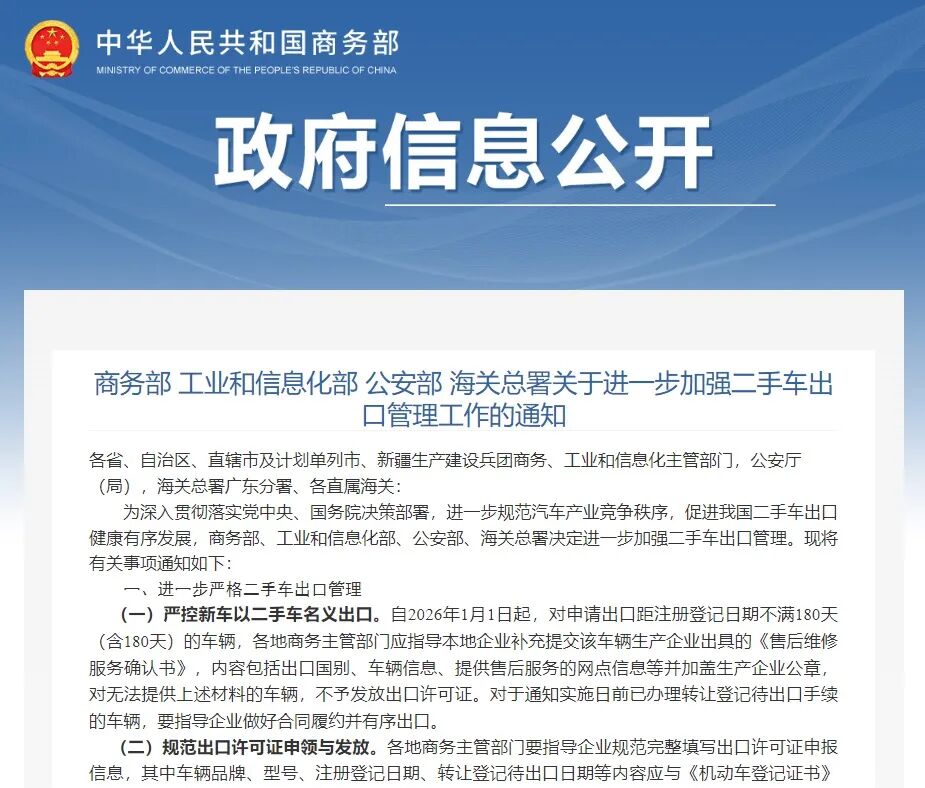 “挥泪大甩卖,最后三天”——这不是街边小店的促销噱头,而是2025年末二手车出口圈的真实写照。9月26日颁布《公布对纯电动乘用车实施出口许可证管理》10月9日颁布《关于 2026—2027 ...